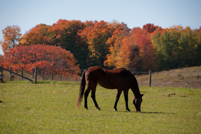 We saw some beautiful fall colours while driving in Ontario last autumn. Unfortunately, this horse got in the way.