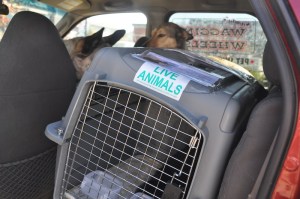 Well, yes… but it was a tight squeeze, what with the 3 large dogs that were sharing the front and back seat of the thing, without any crates, leashes or other controls. They were climbing over the seats, tongues lolling out of their mouths, anxious to meet (eat!) our cats. “No problem… (says, Sandy)… they’re used to cats.” Of course, our kitties are not used to dogs. Even camp is a cats-only facility. Ellie and Lester were loaded into the (dog-free) back of the vehicle, while poor Malachi had to share with 2 of the dogs in the back seat.