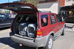 We then transported the cats from Calico Hills (their home away from home) to Whitemud Creek Vet Clinic where they had their final checks and treatments. Then they were picked up by Sandy’s Waggin’ Wheels (isn’t that a great name for a pet taxi service!?) to go to the airport. Lisa looks out the window of the vet and thinks “Oh, an SUV; I think that will be big enough for the kitties 3 crates.”