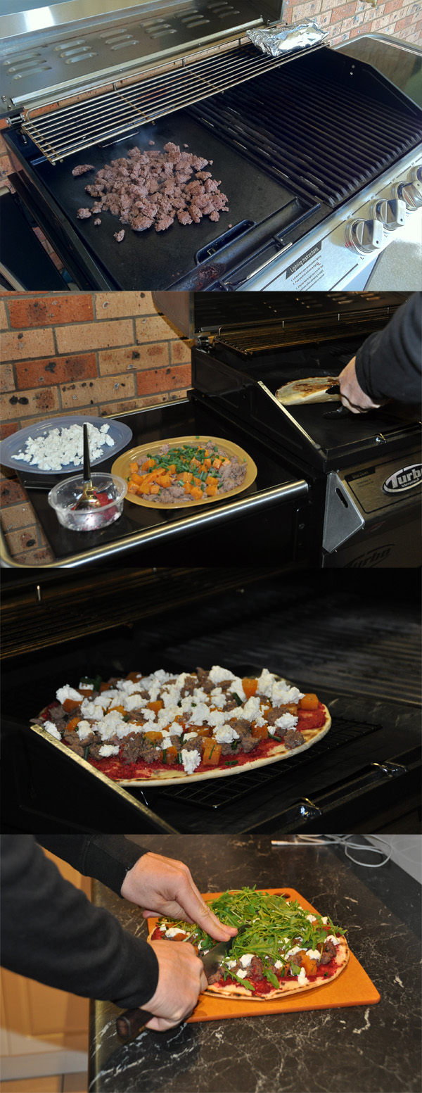The next big experiment, however, was pizza. This is the ultimate Aussie pizza. Kangaroo mince and kumara, with beet and macadamia pesto for a sauce and a local(ish) goat cheese. Crust came from The Artisan Baker (great French baker in town!), and it was all done on the barbie, then topped with rocket (arugula for all the Canadians).  The picture on the right, if you haven’t figured it out, is a few steps along the way: browning the kangaroo and roasting the kumara, starting to cook the crust, with the toppings on the barbie, and then finished with rocket and being cut to serve.