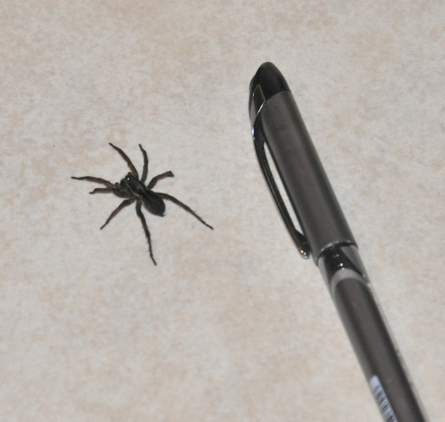 This is one of the spiders that just appeared on the dining room floor. Before killing it, Dan tossed a pen down beside it and photographed it so you can all see how bit it is. Nice of him, eh!