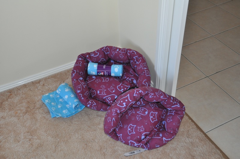 We bought some blankets and 2 cat beds - a 'single' and a 'double' - thinking that the boys would share the big one and Ellie would use the other one. We have now actually gone and bought a third one, because that plan just didn't work out.