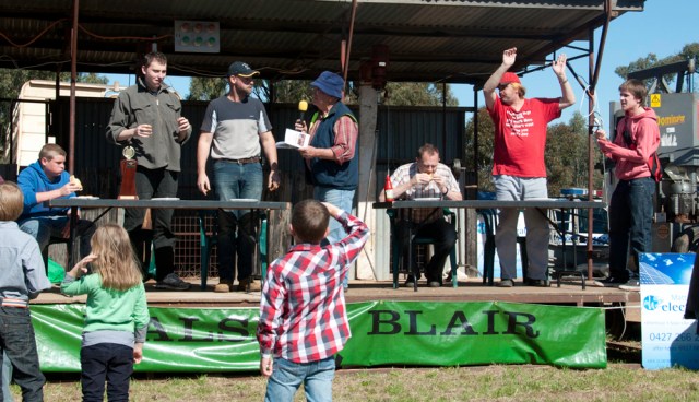 And, of course, the pie-eating contest! You may have seen such things on the news in Canada, even watching reports from the US now and again. Competitors across North America engage in pie-eating rites of passage of all types – cherry pies, lemon meringue, apple… you name it. Often, these are very messy competitions (no forks allowed!), too. We’ve seen ‘Ganmain Pies’ advertised around Wagga in the weeks that we’ve lived here and always wondered what they were. Well, now we know! In another example of the UK influence, pie in Australia often refers to meat pie – and Ganmain is no exception. High noon marked the start of the Ganmain Pie-eating contest and Dan decided that he was up to the challenge. If nothing else, it would be a cheap lunch; the entry fee was $5 for 3 Ganmain Pies. Luckily, the pie is hand-sized, about 4 inches across; it’s filled with a mince (lamb perhaps?) and gravy combination and the crust is super-flaky. Lisa’s task was to take lots of pictures and try not to fall off her seat laughing!