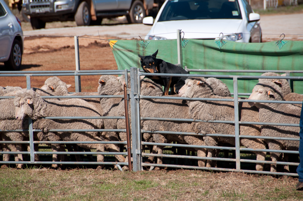 Unfortunately, the Ganmain Show website let us down; we actually missed a few big events, such as the equestrian jumping. And we didn’t see much of the NSW Yard Dog Championships, but what we did see was pretty cool! Australian sheep dogs are kelpies; they are quite small, very fast, and from watching them herd sheep at their masters’ commands, it seems they are very smart. And, their best trait is that they are nimble enough to walk on top of the sheep; seriously! In the competition, a bunch of sheep would be let into a pen and the kelpie would round them up into a small area; the dog would then climb on the sheep’s’ backs and herd them through a gate (just like they were being prepped for shipping); then they would do it again into another gate area. The dog owner would give commands, some using words, others strange noises, or even just whistling. The whole thing was timed and the winner was the one who could do it fastest. Very interesting to watch!
