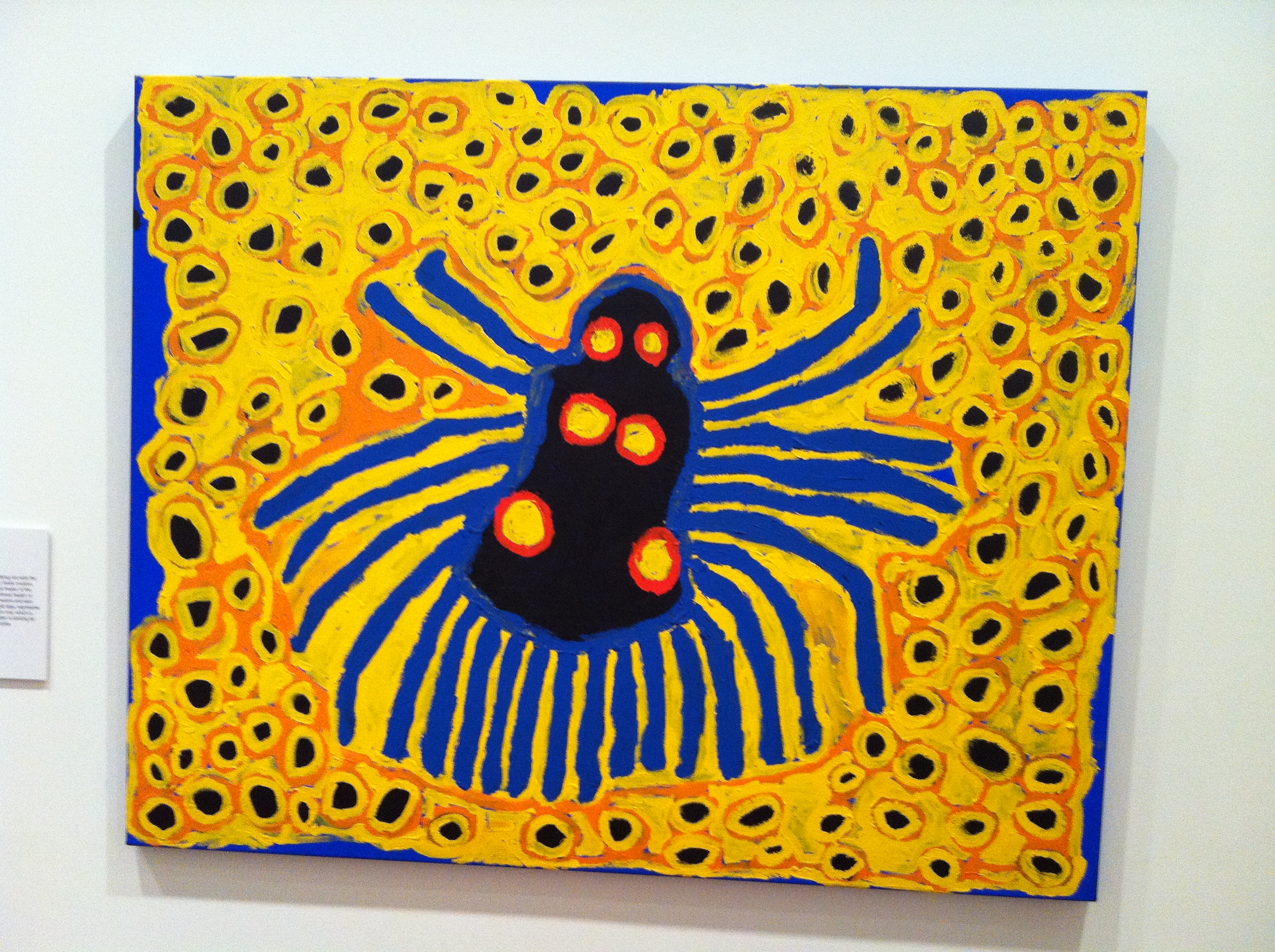 First up for us was an exhibition of indigenous painting called Living Water. The basis for the exhibition was that in the last decade or so, many of the indigenous communities regained land rights and, following that, decided to document some of the historical and contemporary information about their relationship with water in the western Australian desert. But, ‘documenting’ to them isn’t about writing it out, it is about painting the story. But what is really interesting is that the art is quite abstract, much of it in the aboriginal ‘dot painting’ style, but not all. There were some interesting stories printed alongside the paintings, often about snakes and mythical creatures. It was, for us, a very entertaining and enlightening introduction to aboriginal painting both visually (we’ve seen some, but this was the first really large exhibit, and not of stuff that was in a tourist shop) and for the historical and social meaning of the work.