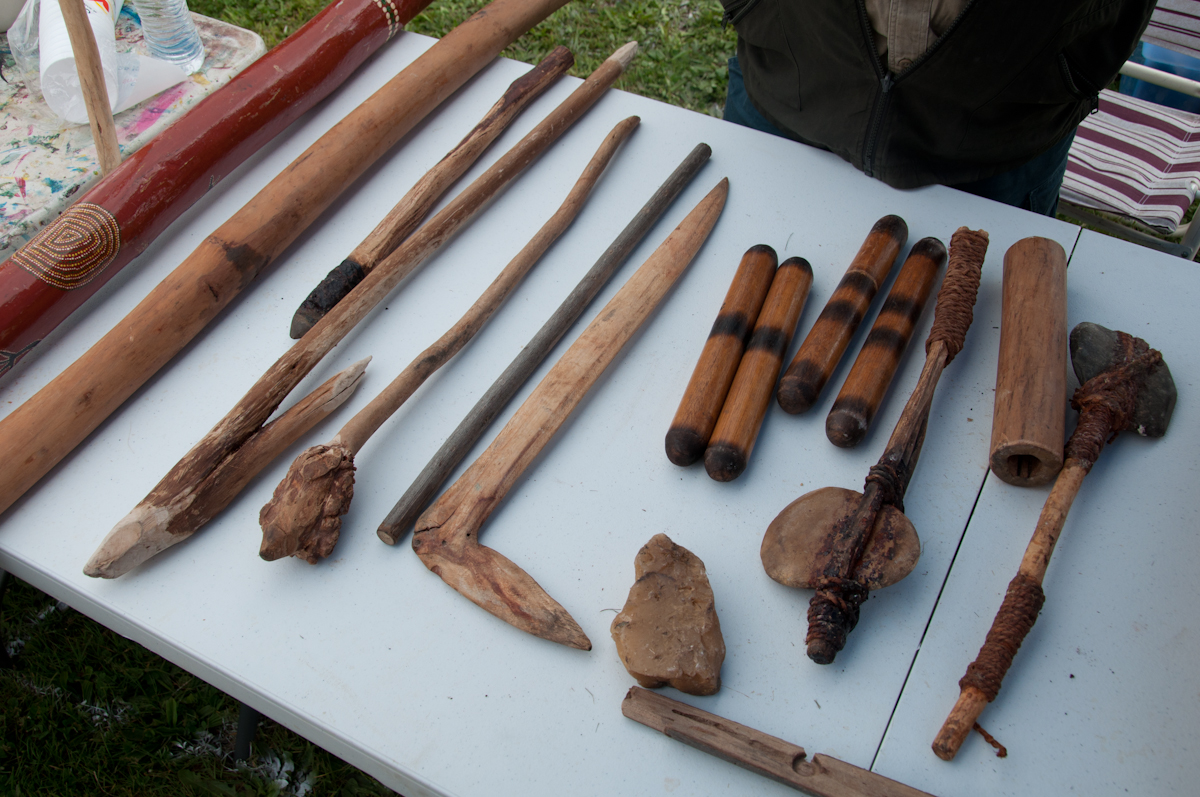 The most entertaining thing at the festival was that we had a long chat with an indigenous woman (maybe Wiradjuri, not sure though) who works for the local parks service. She was there with a display of traditional tools that she takes around to schools to teach kids about Aboriginal culture. Given that we know absolutely nothing about it, what she told us was very informative. She told us, for example, that there are different types of boomerangs and discussed how each was used.  She had on the display table some different bowl-like vessels made of bark, and she explained how they were created. She showed us an emu call. And she had a didgeridoo, of course. That was interesting because she said that as a woman, she was allowed to handle it but not to play it. She could hand it to Dan, and even though he is white he would be allowed to play it because he is male. But she can’t play it, even though it is from her tribe.