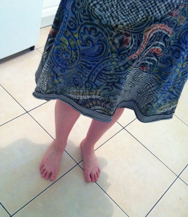 Lisa is being a complete rebel by not wearing her shoes, or even her moccasins, in the house. And she is risking spider bites on her toes. She may, or may not, be wearing a thong (and risking spider bites!)