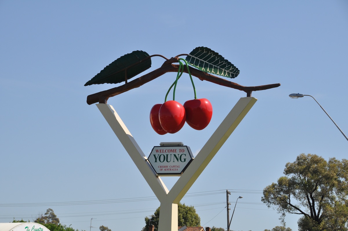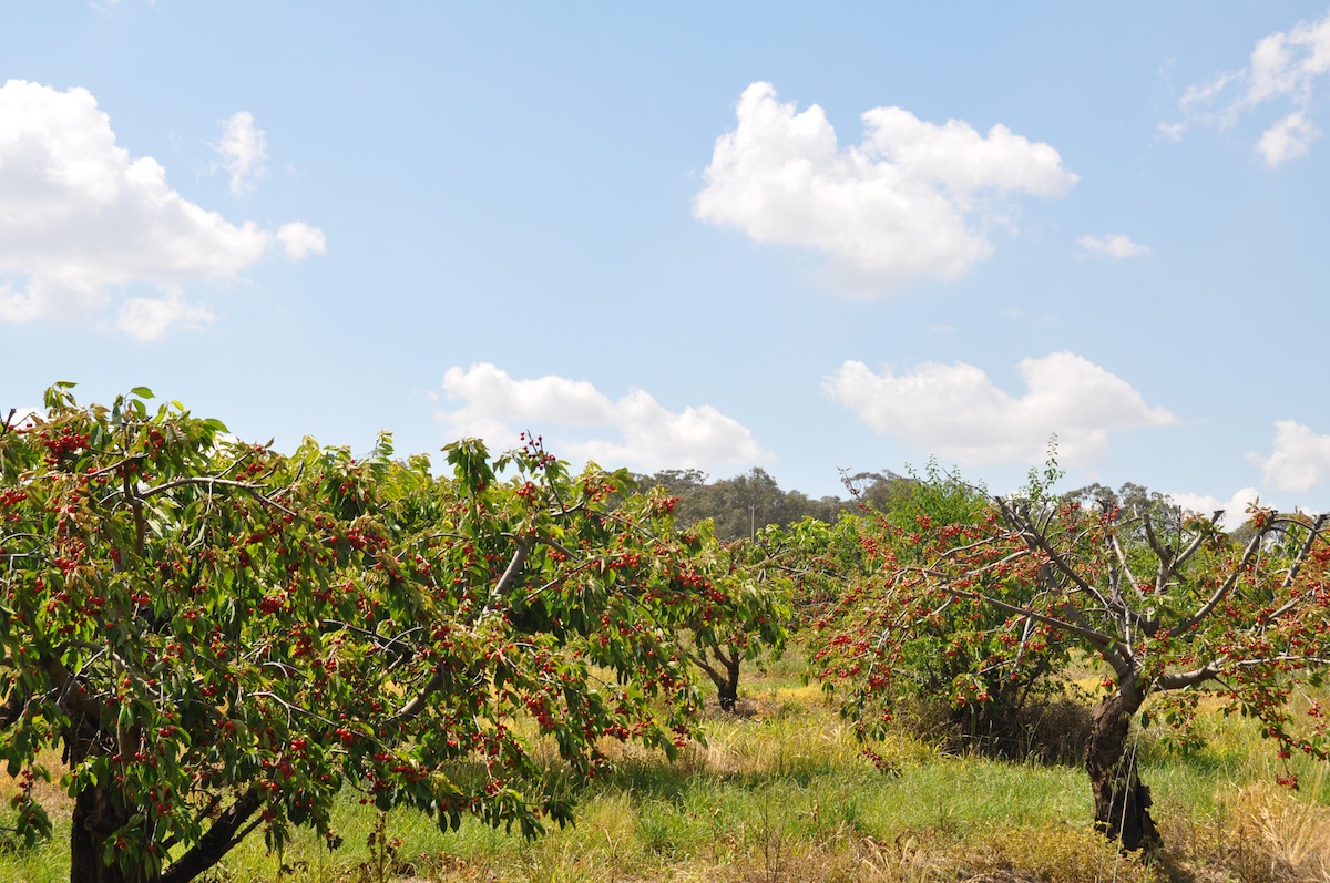 A couple of weeks ago, while driving back from a work trip to Bathurst (CSU has a campus there, so we’ve both been a few times), Dan left a trail of cherry pits from Young to Cootamundra. He had just bought the first cherries of the season. Literally, the first. There was one grower selling them, and they had just opened their stand about 1/2 hour before he drove through. He bought 3 pints, and ate most of one punnet, spitting pits out the window as he drove. Young, for those not in the know – which is probably about 99.999999999% of the world – is the cherry capital of Australia. It is a small town, 150 km north of Wagga, and because of its climate (1400 hours at below 7 C…they call this a cool climate!)  and geography (it is known as the Hilltops region) is ideal for growing cherries, stonefruit, and grapes. So what better thing to do on a warm (35C) spring day than run to the hills in the height of cherry season.