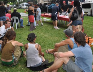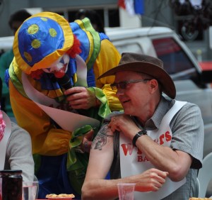 But, when he was settling into his seat for his heat, Dan showed his true colours, literally. He stepped a couple of seats over, tapped a Quebecois picker (Sebastien) on the shoulder, pulled up his sleeve exposing the Inukshuk tattoo, wished his fellow Canadian good luck, and sat down. This intrigued Milo the clown (sort of the Cherry Festival equivalent of Ed McMahon) who actually settled down for a while and interviewed Dan about the tattoo, having him show it to the entire crowd (500+ people) and explain the meaning. This got a round of applause from the small cadre of Canadian hippie-chicks at Sebastien’s feet…of course, once the eating started they went back to cheering for their fellow back-packer.