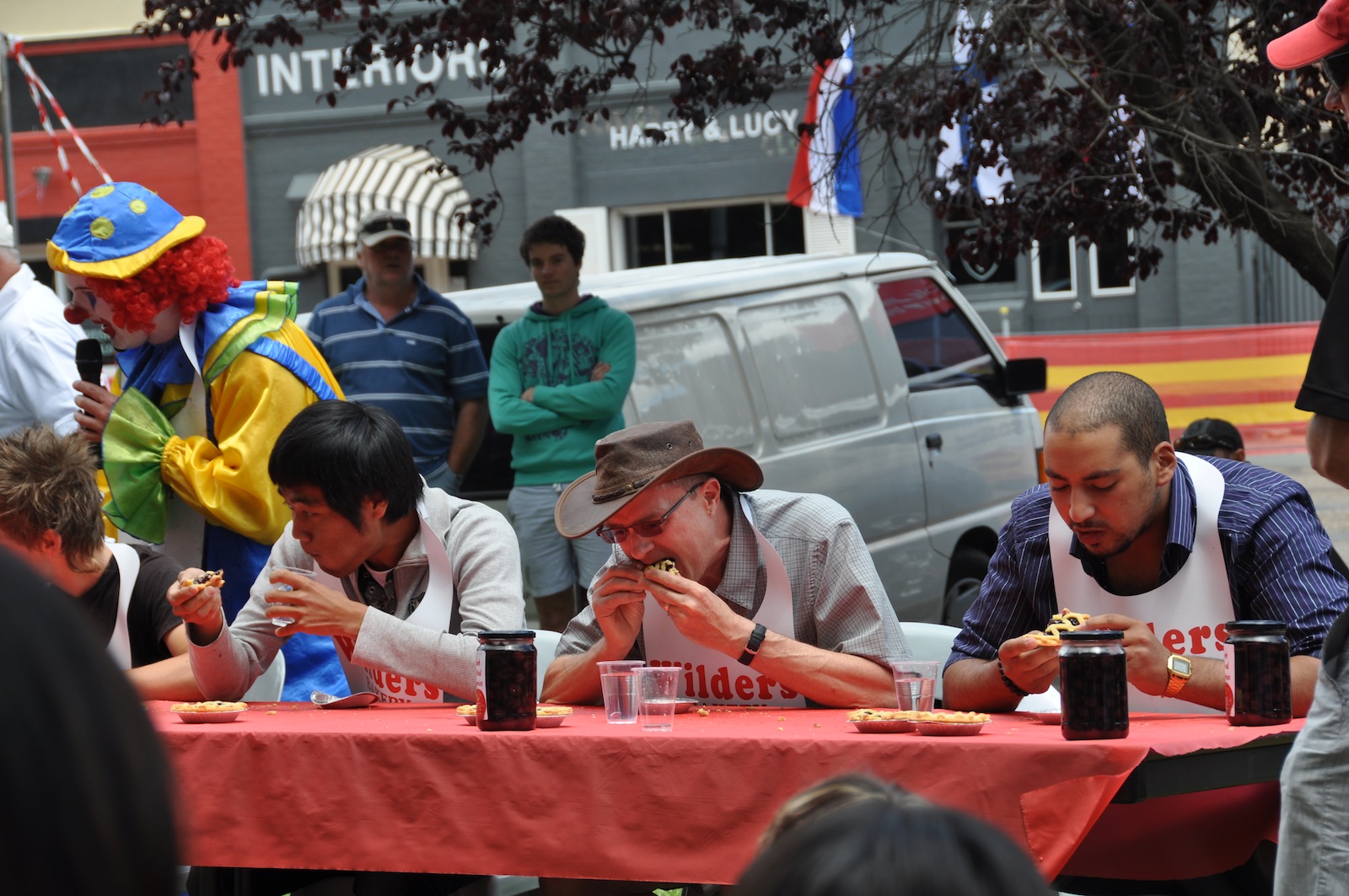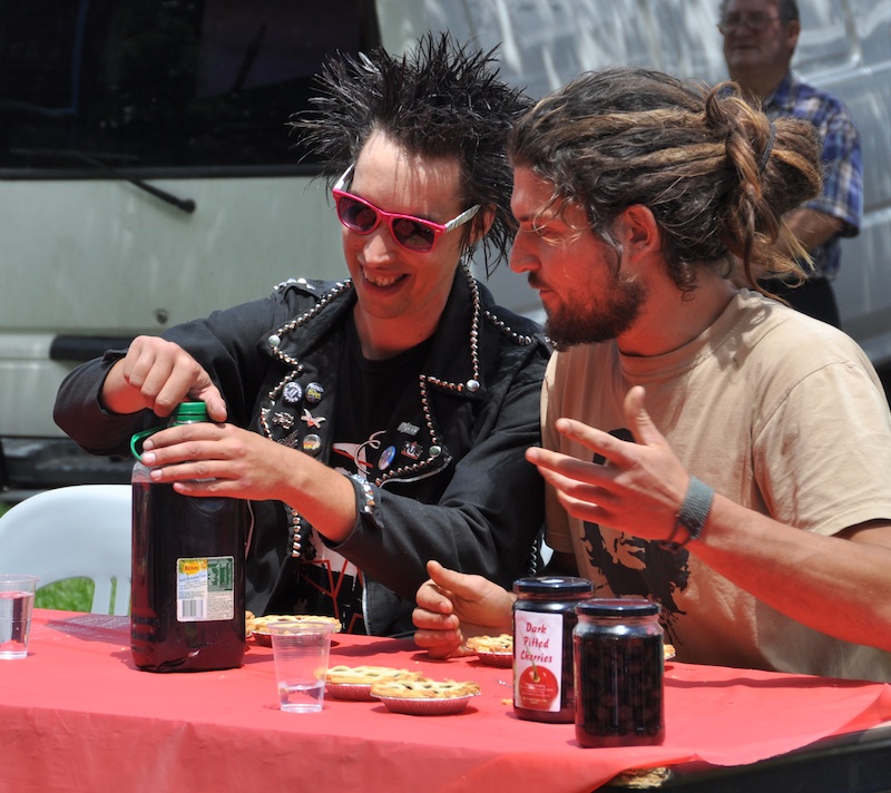 Like moths to a flame, this kind of transient/traveller/hippie is attracted to free food. And there was free food at the Cherry Festival. Not for everyone though – only those who entered THE PIE EATING CONTEST! And guess who was there in the registration line with all the hippies. Not Lisa… Dan had hoped that this would be the third competition of a trifecta, but the Batlow apple pie eating contest was a bit of a dud. So, for his second pie eating contest in Australia, he was up against 53 other competitors: a whole lot of migrant workers and a few locals, or, as the (really pathetic) emcee put it “pickers and permanent people”. Oddly, we don’t know which class we fit into. We only have temporary visas, as we are just now applying for PR status. And we did pick cherries that morning. But when the emcee called the competitors for each heat, he said where they were from, as self-declared on the registration form. There were competitors from England, France, Korea, Japan, Brazil, and even Canada. Dan, however, had listed home as Wagga. So, sort of a ‘permanent’ maybe…