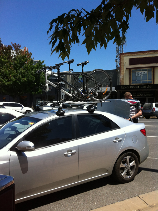 Next morning, after a hearty brekkie, we went back to Milawa, parked the car and cycled almost to Wang. On the way back, we stopped at Sam Miranda winery in Oxley (about 6 km out of Milawa) for a tasting and ended up making a lunch reservation…quick pedal back to the car, changed our clothes and drove back to the winery for another amazing lunch, out on their patio among the parrots… Sam Miranda isn’t a huge winery, but it is pretty spectacular. The cellar door/restaurant is stunning! Make sure you look at the website to see it. Though a relatively small winery in the big scheme of things, Sam obviously has a lot of money to build this place, to buy other wineries like Symphonia, etc. And so bike friendly he even sells jerseys with his logo on them. Yes, we each bought one (Dan’s is white, Lisa’s is rosé).