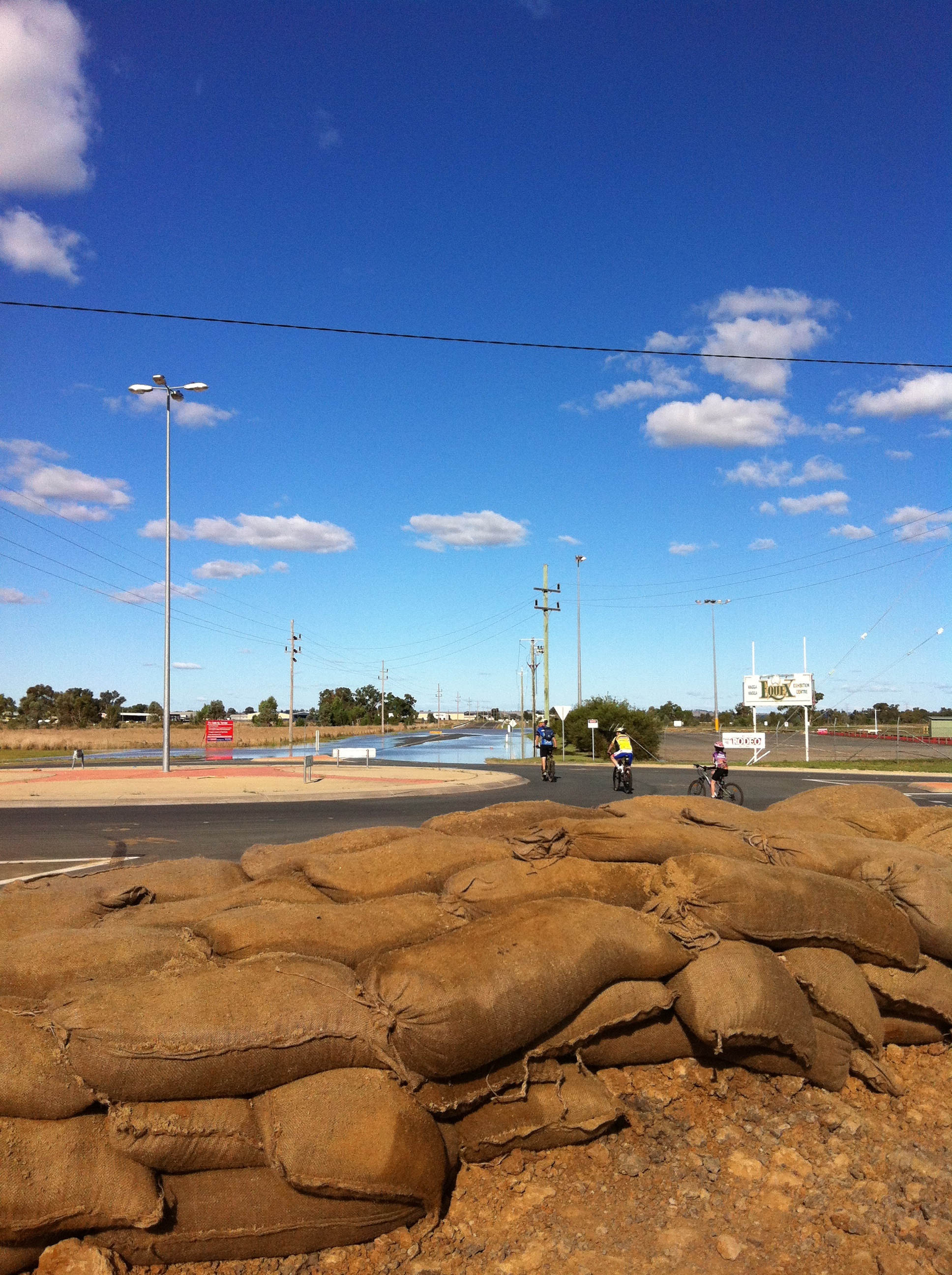 One of Lisa’s colleagues was evacuated and spent last night in a church. She and her housemate have just arrived here at the house, as a more comfortable safe haven, as we write this. Dan is out at Woolies, scavenging the grocery store shelves among the other “panic” shoppers. Gas stations are lined up around the city, with rumours of $2.50 per liter petrol. As the centre of town is evacuated, grocery stores are also now closed, so our neighbourhood is one of a few that is now feeding the city’s residents. We also know some people who evacuated out of North Wagga on the weekend and others who will have left central Wagga last night. We assume that since they have all been here longer than us, they all have places to go beyond the shelters that have been set up in schools (and the school kids are getting a snow day too, while the classrooms are mobilized as shelters). Other colleagues and friends have also taken in some of the flood’s refugees – so at least those of us who are high and dry can feel like we’re helping.