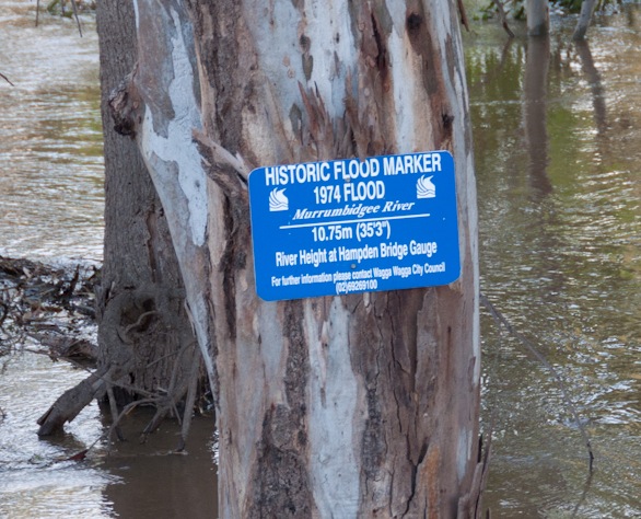 Some stats: at Wagga, the Murrumbidgee is normally around 2 m deep. The minor flooding level of 7.3 m was reached at 6 pm on Saturday. The moderate flooding level of 9 m was reached Sunday night at about 9:30. The major flood level of 9.6 m happened at about 10 am on Monday morning. At this level, much of North Wagga – the area of the city north of the river – is under water and cut off. It was evacuated over the weekend, with most people and their pets and livestock having left. But it is still pretty devastating for people who live there, to see their property covered in several feet of muddy water.