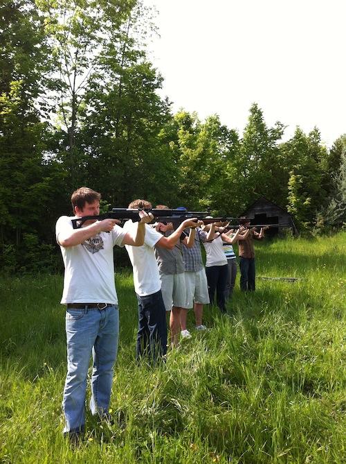 And then, with everyone safely mustered again, the grand finale of the afternoon: a 21-gun salute. As we said, Dad was a former soldier and a hunter, so it seemed a fitting tribute (suggested by a niece, facilitated by her husband who is another avid hunter and has several rifles). Dan and 6 of the nieces and nephews lined up and each fired 3 times (toward some blocks of wood that were set out, but 4 of the 21 hit…there were a lot of flying leaves in the bush behind!). Dan got to use his father’s old deer rifle…