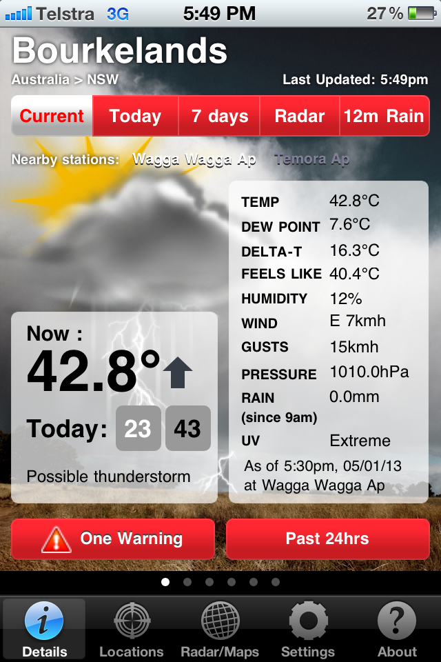 So, what has happened in the 10 weeks since last post? Let’s see, we’ve learned a bit about heat. On Saturday, 5 January, 2013, we lived through the hottest day we’ve ever encountered when the temperature in Wagga hit 43.5 C. It was, barely, bearable. Thankfully we have refrigerated air con – we spent most of the day indoors. But wait, there’s more: Friday, 18 January was even hotter, topping out at 44.1. Not that it was noticeable – at that point, a half a degree makes little difference! But the opposite effect is that when it starts to cool off in the evening it becomes very noticeable, with Lisa running for a jumper when it got down around 25!