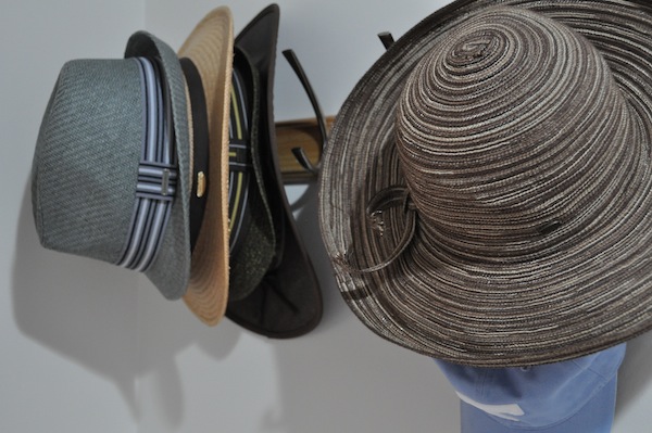 A hat for every occasion. When we moved in, we installed a ‘coat rack’ in the entry way…it’s become a hat rack. And Lisa has more in the closet, including one she wears under her bike helmet.