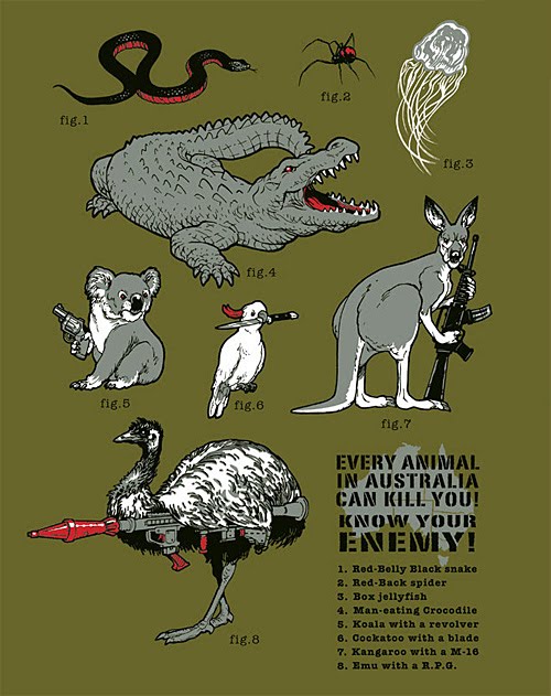OK, maybe it is more important to know that when you get here, you will be in serious danger. The cuter they are, the more deadly – everyone knows that a snake or a spider is dangerous, but did you know that female kangaroos keep M-16s in their pouches? Yes, roos can get concealed carry permits…Australia is just like Texas.
