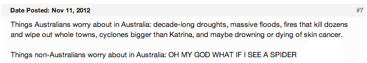 As an aside, for this post I was trying to find a picture that was floating around on facebook a few months ago, about how everything in Australia can kill you. I did find the picture I was looking for, but used the one with the over-armed emu instead because fewer people have probably seen it. But in my searching, I came across a discussion forum about moving to Australia and this post just fit so well after some of the shit that’s been going on here recently: